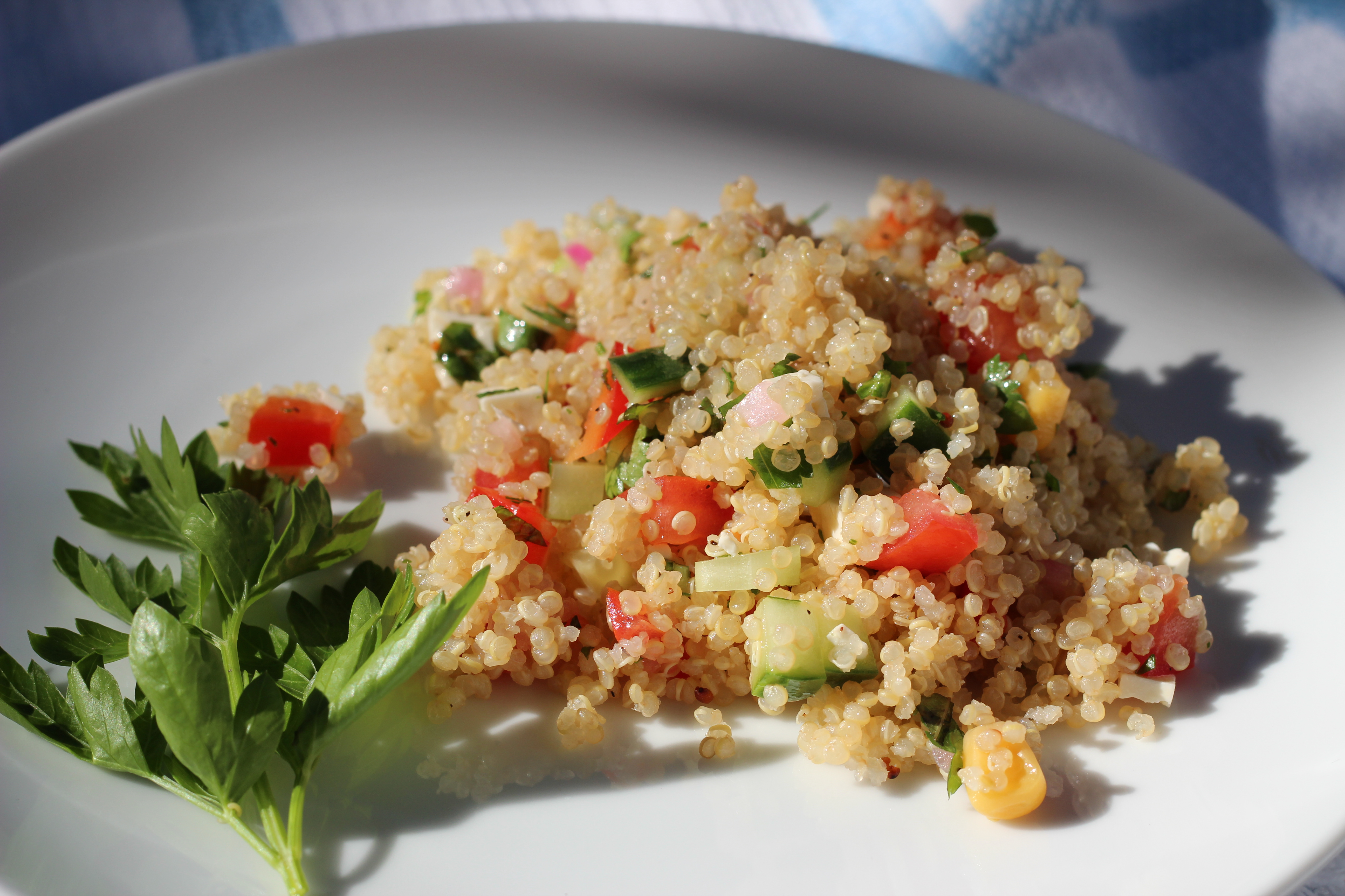 So, Vancouver is being hit with a heat wave! I know it doesn’t get as hot as other parts of the country, but that’s why we live here, because you can wear the same clothes year-round. So when the temperature gets to 26 Celsius I’m all, Seriously? And I used to live on the equator. But in very hot places everyone has air-conditioning. In Vancouver we only need it a few days a year so it’s not worth it, but when it’s hot, it’s awful. In the summer I watch the forecast and get anxious days in advance if high temperatures are predicted. Our house gets really hot and I can’t sleep in the heat. My office is upstairs and it’s horrible to work with your body parts sticking to your chair and desk. So I prepared Quinoa Salad so we’d have something cool and light to eat for dinner and also so I’m not dealing with a hot stove. I’d barbecue but our barbecue isn’t working and we haven’t fixed it yet because, I don’t know. Maybe it’s really comforting to have yet another nonfunctioning piece of equipment in our garage.