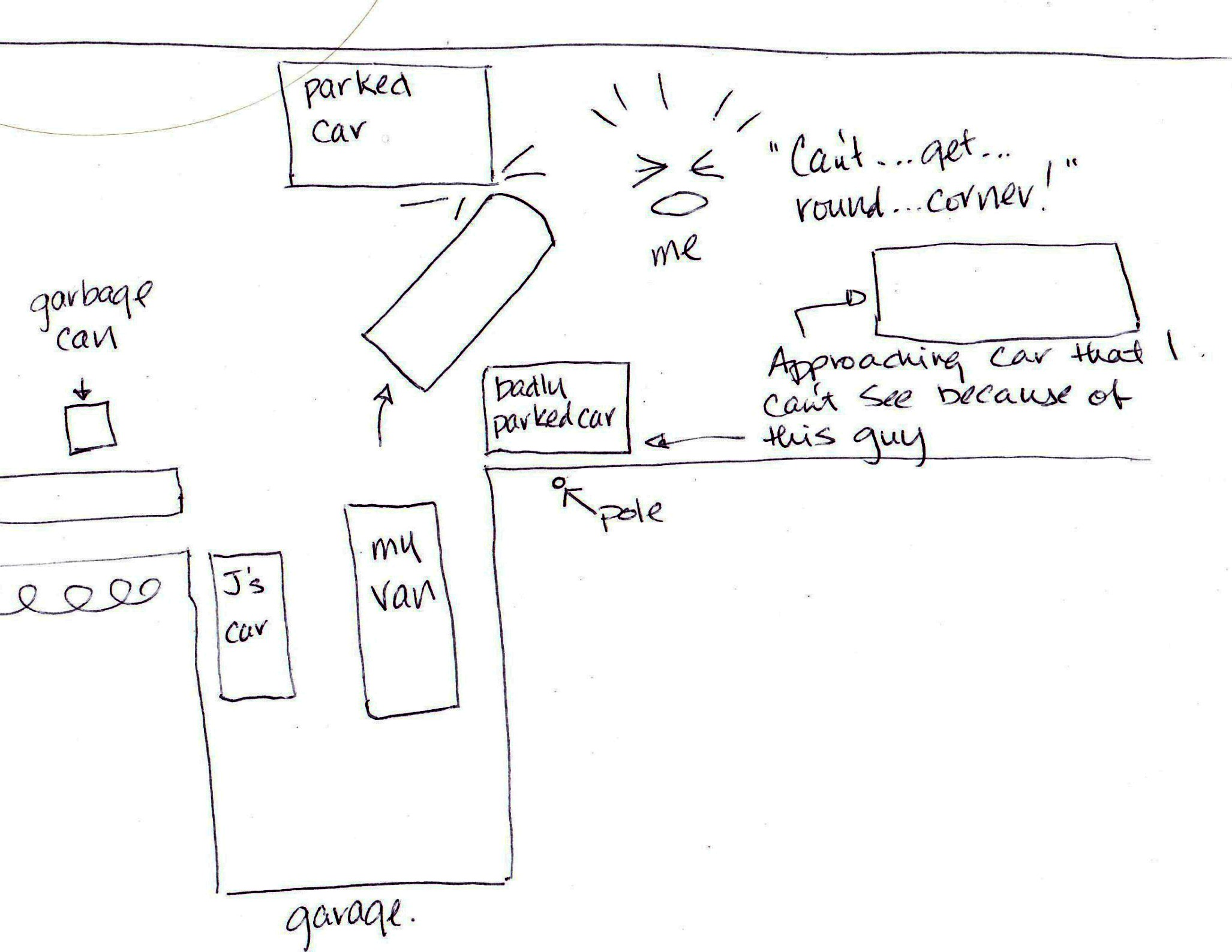 We are one of the few houses in the neighbourhood to have a driveway. But I also have a Honda Odyssey, a longish minivan. If people park too close to either side of the driveway, and especially if someone then parks on the street across from our driveway, I have a terrible time getting in and out of the driveway and hence into the garage. The van is just too long. Plus, if someone is parked that close to the driveway I can’t see oncoming cars. Justin has placed our garbage bin just in front of the house on the left side of the driveway to prevent cars from parking on that side. Plus, it’s convenient on garbage day. It’s not the most aesthetic arrangement but it works. But people do park very close to the other edge of the driveway and that’s the worst for me because that’s the direction in which I’m usually heading.