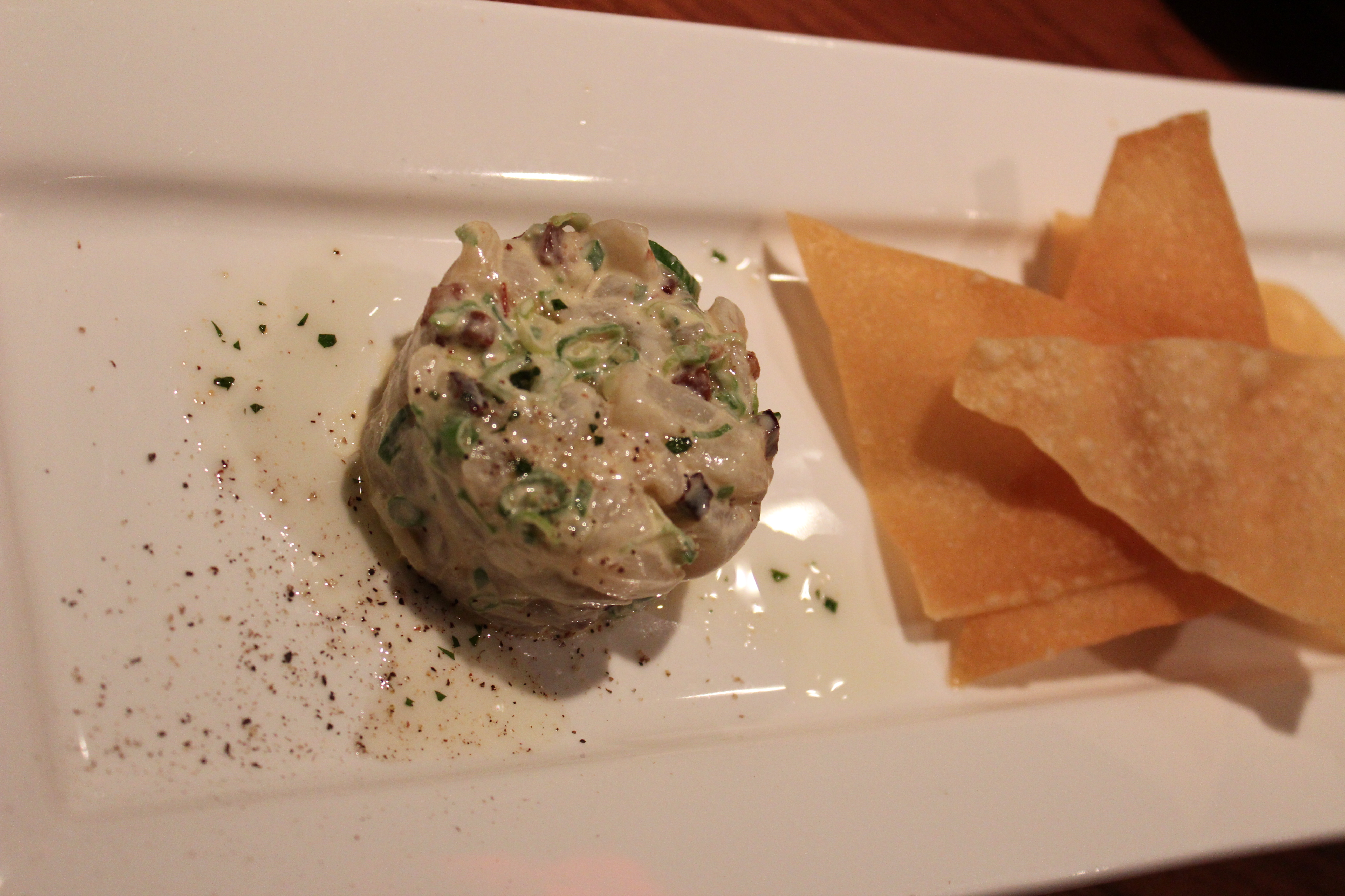 Scallop Tartare: chopped scallops, bacon, karashi mustard mayonnaise, wonton chips – but it’s ungarnished as it’s for tasting purposes only. Usually this would have some kind of fluff of alfalfa sprouts, some finely julienned radishes, that kind of thing.