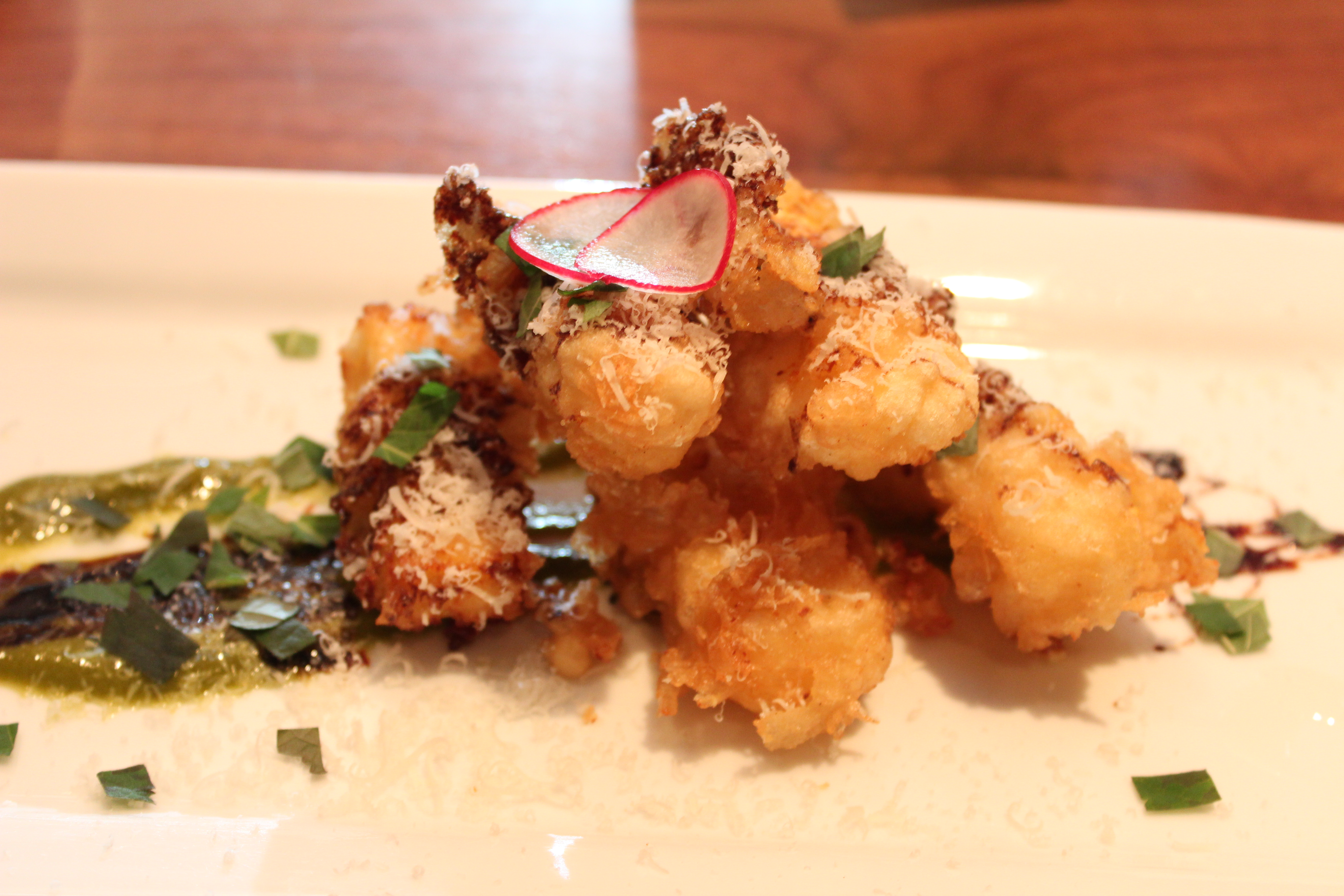 Did I say I was fat-phobic? The hypocrisy! Well, it’s not meat fat. These are totally worth the calorie count. Crispy light tempura surrounding melting, hot, cheesy, creamy corn goodness? A little shmear of arugula gel for a touch of tartness? A drizzle of balsamic reduction adding its sweet acid to the mix? What’s not to like? Oh, right, the mile I’ll have to run to compensate for the calories. This is one reason I don’t drink: because I want those calories for things like pasta and cupcakes.