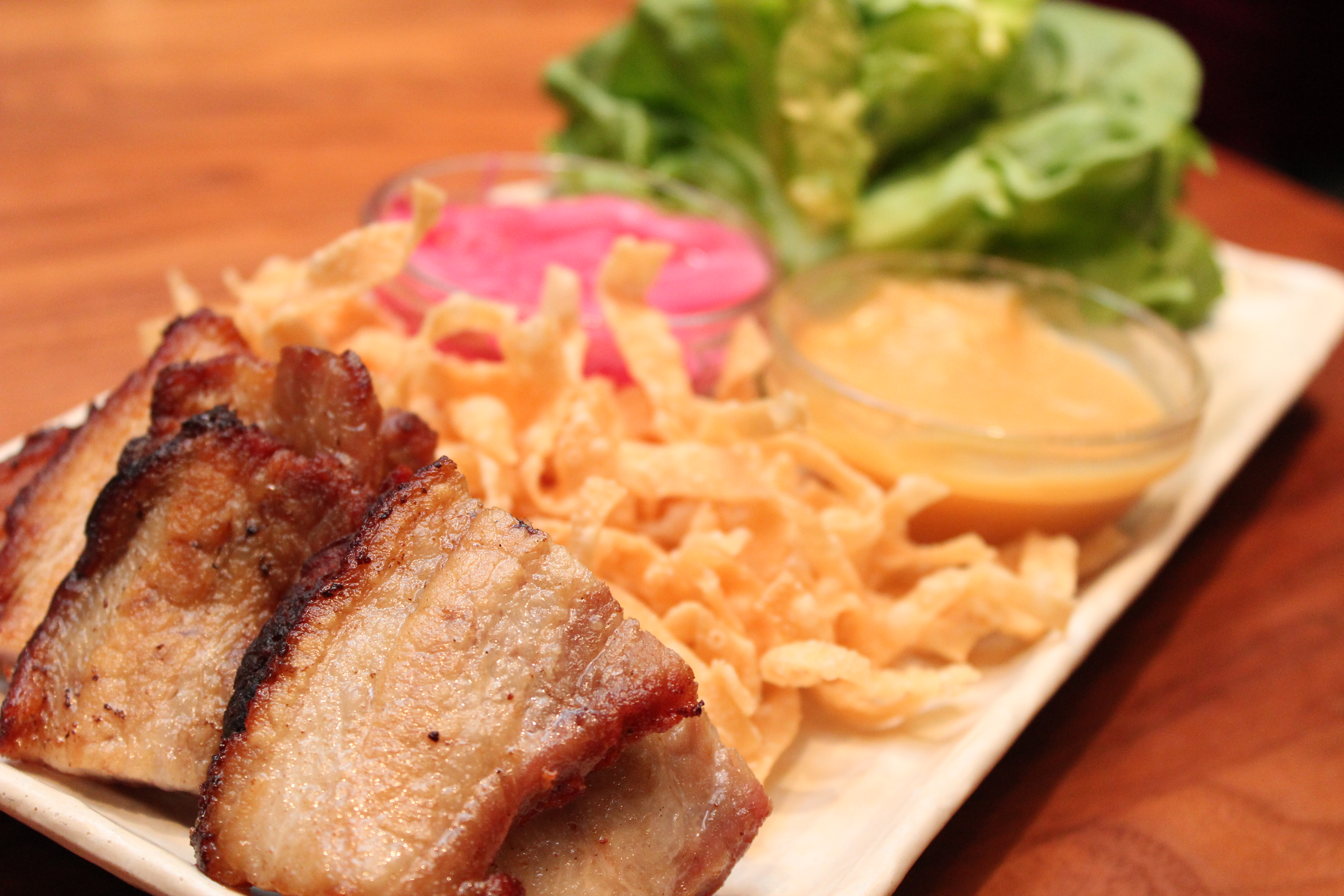 Pork Belly Lettuce Wrap, with crispy wonton bits, apple-yuzu jam and pickled red onions